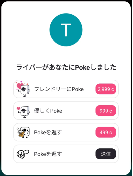 ライバーからPokeされると、画面にポップアップが表示されます。
