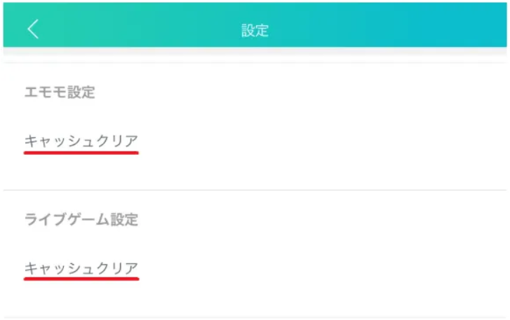 4. 下部にある ・エモモ設定のキャッシュクリアライブゲーム設定のキャッシュクリア をそれぞれ実行する