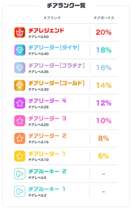 | ギフトボーナス | 「チアリーダー」ランクでギフト時のExpに6〜20%の追加効果 |