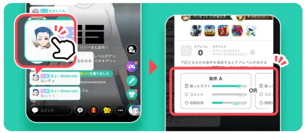 チア機能とは、コメント・ギフト・視聴といった「応援行動」がポイントとして蓄積され、応援度合いがレベルやランクに反映されるシステムです。