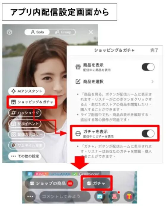 • アプリ:「配信設定」→「ガチャを表示」ON