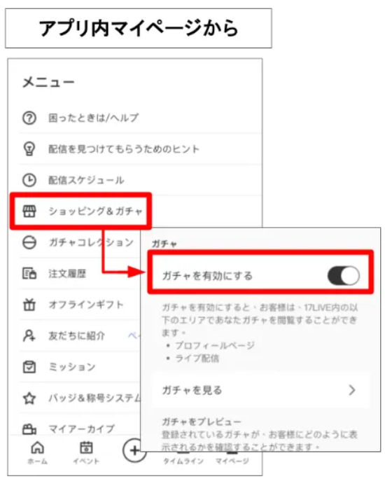 • Web:「マイページ」→「ショッピングとガチャ管理」→「ガチャを有効にする」ON