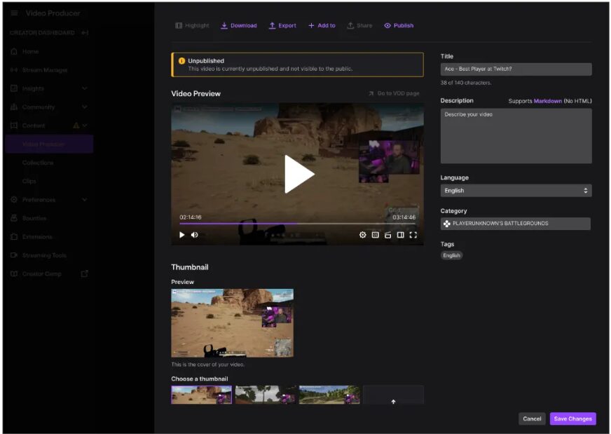 編集では、タイトルや説明文の変更、不要部分のカット、サムネイル調整などが行えます。